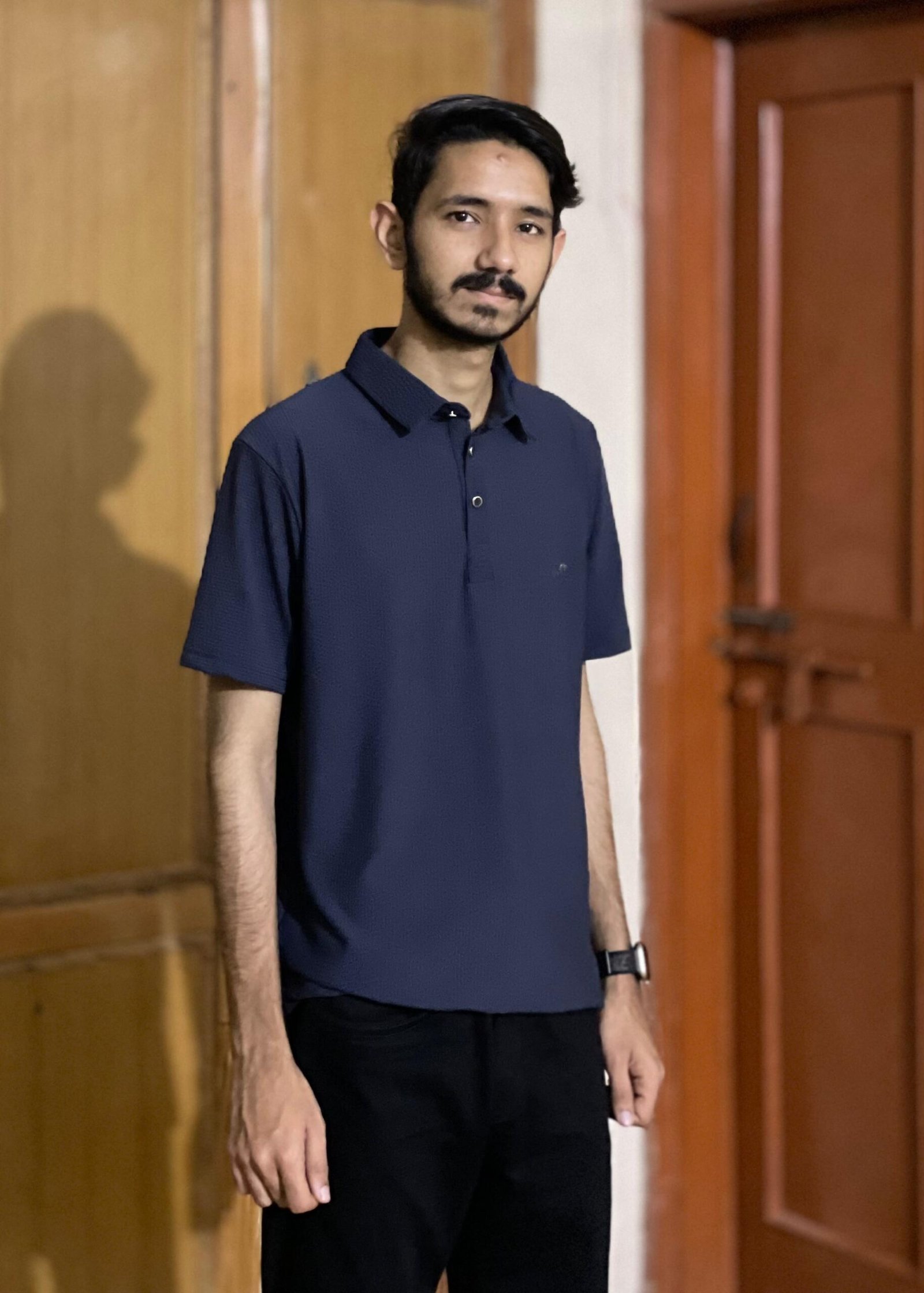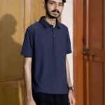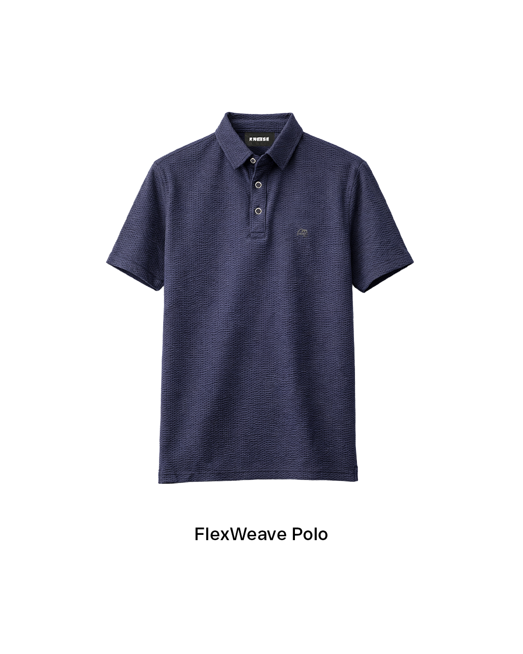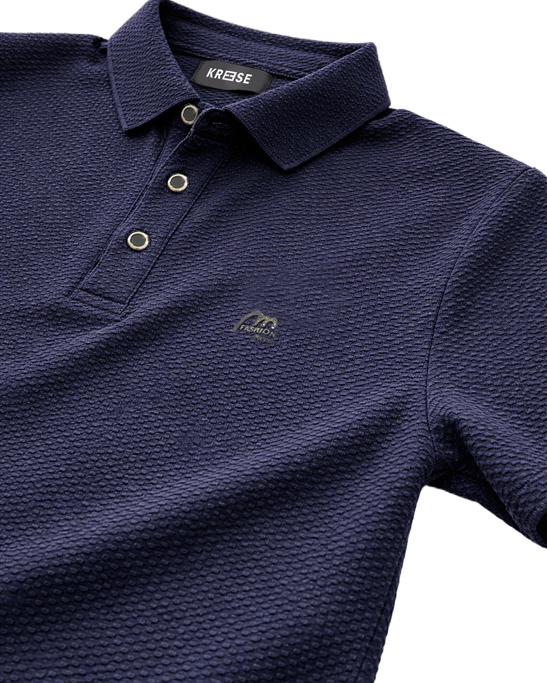Crafted in a breathable, textured knit, this deep slate-blue polo features a subtle micro-waffle surface that feels light, elastic, and fluid on the body. Likely a polyester–spandex blend with a touch of cotton, it’s designed for men who want everyday comfort with a refined, modern look.